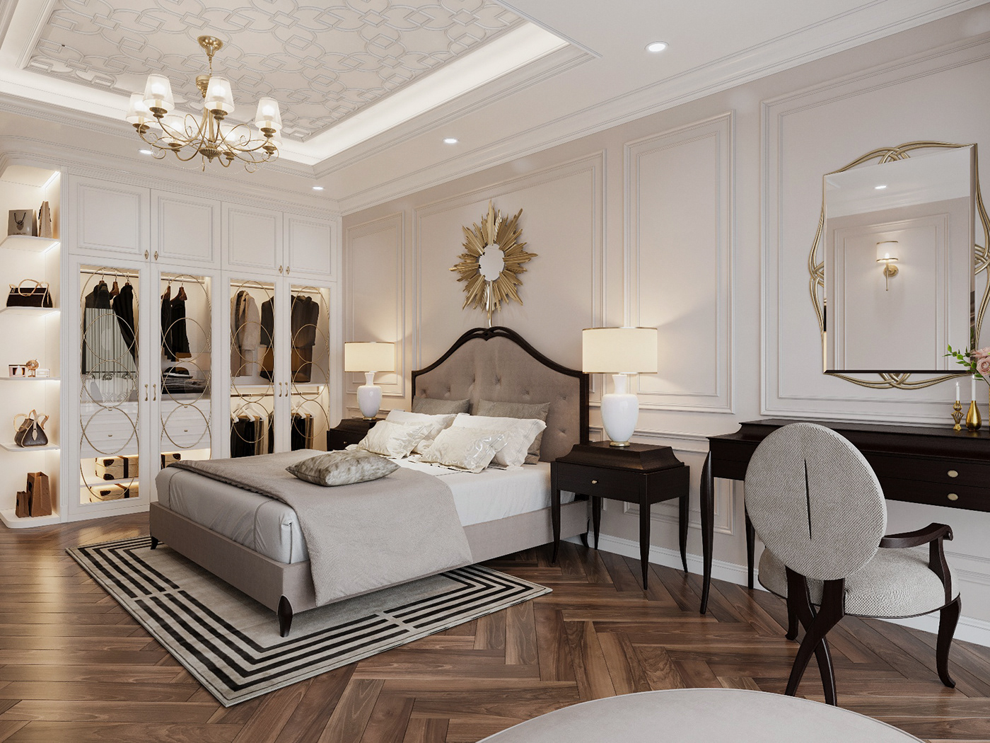 Khác với sự lộng lẫy xa hoa thể hiện ở phong cách cổ điển, quý phái và trang nhã sẽ là cảm giác khi chúng ta trải nghiệm không gian nội thất mang nét tân cổ điển. Nó được lột tả rõ nét qua việc sử dụng màu sắc chủ đạo, ở đây sử dụng gam màu sáng trung tính: trắng, kem… đem đến cho người nhìn sự dễ chịu, mát mẻ lại làm ta có cảm giác không gian trông rộng rãi, thoáng mát hơn.