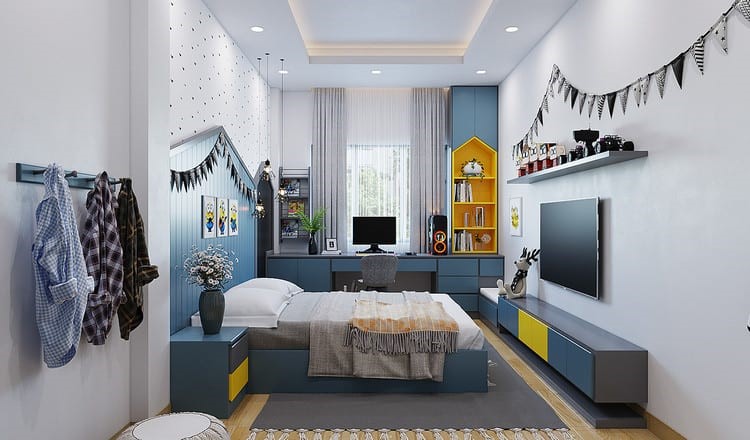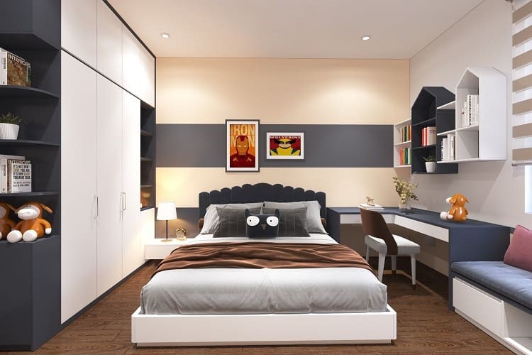 Thiết kế nội thất phòng ngủ cho con trai lớn thường đơn giản hơn so với thiết kế cho các bé nhỏ tuổi. Bởi ở lứa tuổi này các bé đã bắt đầu bộc lộ sở thích và cá tính của mình rõ ràng hơn về màu sắc, phong cách. Các bé trai thường thích các gam màu lạnh như màu xanh, trắng,.. Tập trung vào sự đơn giản, khỏe khoắn, không cần quá cầu kỳ trong việc trang trí.