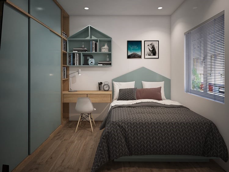 Không gian phòng ngủ nhỏ khoa học. Phòng ngủ cho 2 bé. Thiết kế kệ âm tường và nội thất tối giản cho phòng ngủ nhỏ.