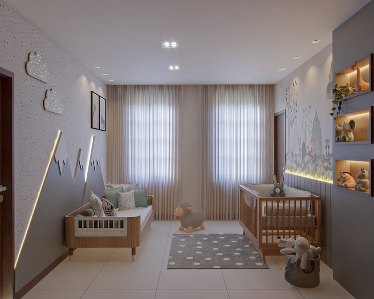 Đồ nội thất thiết yếu: Nôi hoặc cũi trẻ em, đèn ngủ, tủ đựng đồ, thảm trải sàn, tranh ảnh ngộ ngĩnh.