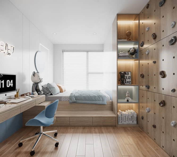 Không gian phòng ngủ khoa học tối ưu công năng. Phòng ngủ nhỏ tiện nghi con trai. Thiết kế phòng ngủ sinh động cho bé trai