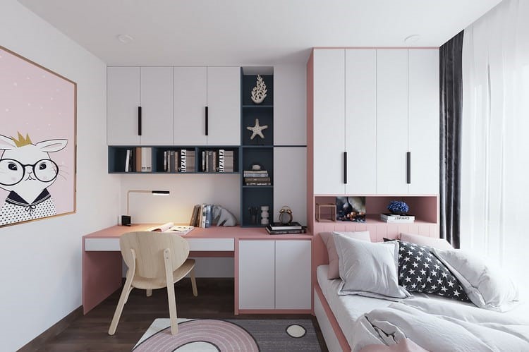 Bé gái từ 8 – 10 tuổi đang trong giai đoạn phát triển tư duy mạnh mẽ, do vậy việc thiết kế phòng ngủ cho bé có tác động rất lớn. Vì vậy bạn nên thiết kế không gian một không gian học tập và vui chơi hài hòa để phòng ngủ không chỉ là nơi nghỉ ngơi mà còn là nơi kích thích sự sáng tạo của bé.