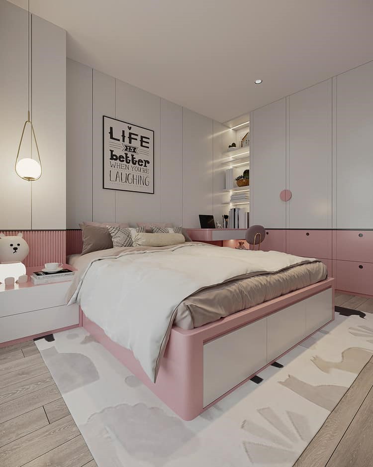 Phòng ngủ hiện đại, đáng yêu cho con gái tuổi teen. Thiết kế phòng ngủ sang trọng, nữ tính. Phòng ngủ nội thất cao cấp, trang trí đáng yêu dành cho bé gái. Phòng ngủ bé gái diện tích nhỏ, nội thất tối giản. Phòng ngủ trang trí nội thất sinh động