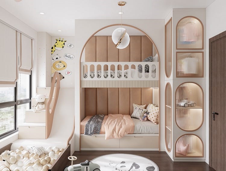 Kiểu thiết kế đồ nội thất: Nội thất được bo tròn các góc cạnh nhằm đảm bảo sự an toàn cho bé, ưu tiên thiết kế đồ nội thất thông minh để bé có thể vừa học vừa chơi.