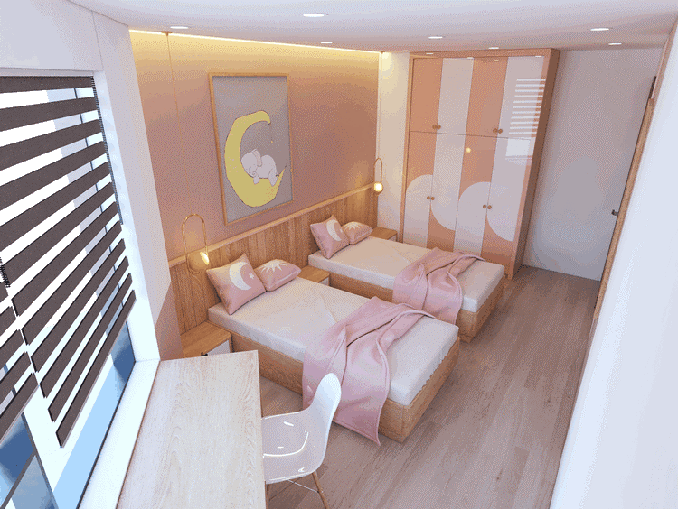 Thiết kế phòng ngủ 2 giường cho bé gái phù hợp với mặt bằng công năng. Phòng ngủ 2 giường trang trí nội thất ngộ nghĩnh, đáng yêu. Phòng ngủ bố trí nội thất khoa học, tiện tích. Phòng ngủ thiết kế nội thất đáp ứng tối đa nhu cầu lưu trữ cho sinh hoạt và học tập của bé. Phòng ngủ 2 giường bé gái kết hợp màu sắc sinh động. Màu sắc tươi sáng và ánh sáng tự nhiên giúp phòng ngủ nhỏ có cảm giác rộng rãi hơn