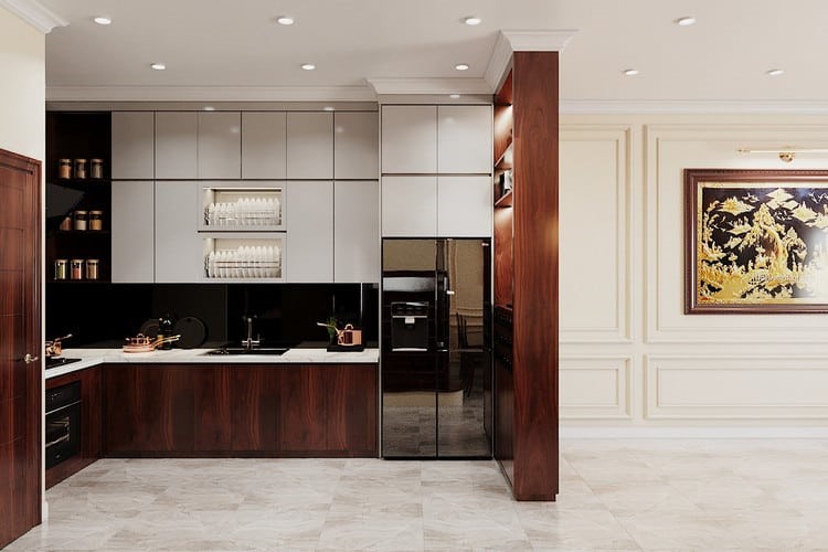 · Không gian bếp rộng rãi khi bố trí hệ thống tủ kệ sát tường và kịch trần