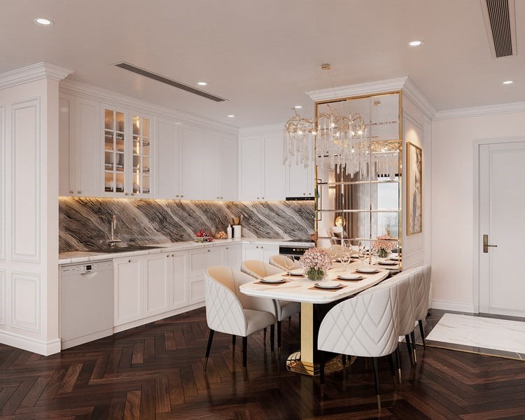 · Không gian phòng bếp sang trọng với gam màu trắng