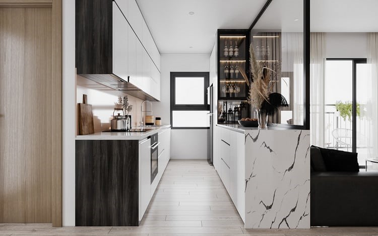 · Tủ bếp được thiết kế phù hợp với không gian hẹp dài trong hành lang